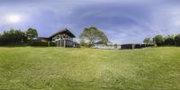 A picturesque residential area in Thailand, featuring a charming home surrounded by lush green grass and trees. The reflection of the home on the grass field adds a touch of serenity to the landscape.