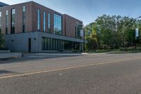 This image captures the urban design of a residential area in Toronto, Canada. The clear sky highlights the modern office buildings and theaters in the business district. Along the empty street, trees line the curb, adding a touch of nature to the urban landscape. The road surface, made of asphalt, reflects the sunlight. This photo perfectly represents a typical day in the suburban neighborhood of Toronto, where residential areas blend seamlessly with business districts.
