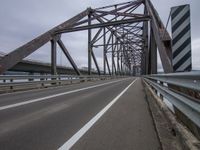 This stock photo features a tied-arch bridge spanning over a river on a gloomy day with a grey sky. The bridge is made of asphalt and has a road surface, with Armco barriers and a guard rail on the sides. In the background, there is a hill and water. A perfect image to illustrate transportation and infrastructure.