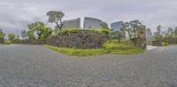 A large stone wall stands in the heart of Tokyo's bustling business district. Surrounded by modern architecture and tall buildings, it creates a unique contrast. The urban design incorporates open spaces and green trees, providing a refreshing break from the city's hustle and bustle.