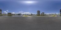 a panoramic view of buildings in the city from a ramp in the middle of the street
