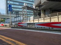 A modern architecture Armco barrier on a highway in Tokyo, Japan. The city's urban landscape reflects in the glossy surface of the asphalt road. A typical day in the bustling city of Tokyo.