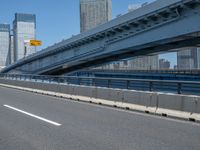 Urban cityscape in Tokyo, Japan, featuring modern architecture and a clear sky. A road with Armco barriers leads to a futuristic bridge. The city's skyline reflects contemporary urban design.