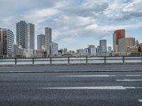 Modern urban cityscape of Tokyo, Japan at dawn. Grey sky above showcases the futuristic architecture and bridges. Armco barriers line the asphalt road, offering a unique profile of the city.