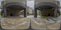 the inside of a building with multiple circular mirrors showing off the outside of it with a building in the background