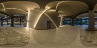 a fisheye photo of inside an indoor building with round arches and stone flooring