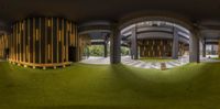 a very wide view of some nice building with columns and chairs on the sides of them