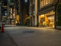 An atmospheric night shot of one of Tokyo's bustling streets. Vibrant city lights illuminate the urban landscape, with storefronts and restaurants lining the road. One-quarter pavers add to the artistic urban design.