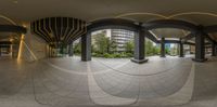 a panoramic picture shows several courtyard spaces with an arched building and curved columns