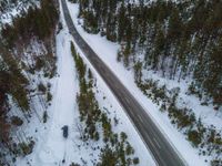 Top Down View of a Car Traveling on an Elevated Snowy Road through Woods