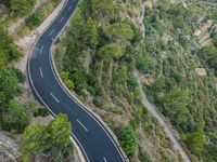 This is an aerial view of an empty, wide road in Mallorca, Spain. The road, elevated above the cliffs and trees, curves and winds its way through the coastal landscape. The green vegetation adds to the natural beauty of the surroundings. In the distance, you can see the expansive ocean, showcasing the high coastal cliffs. This photo captures the tranquil and scenic nature of Mallorca, one of the Balearic Islands in Europe.