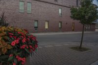 In the heart of Toronto's art district, a clock tower adorned with vibrant flowers stands tall against the clear sky. A charming urban scene at dawn with a residential apartment building in the background.