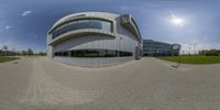 A modern architecture building in Toronto's business district. The straight road and low-rise buildings create a symmetrical urban design. Clear sky and hard shadows accentuate the concrete and glass facade.