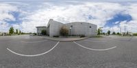 the view from a fish - eye lens of a large building near parking spaces on a street