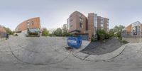 a distorted fish - eye photo shows a road and a big building with a blue dumpster in the middle