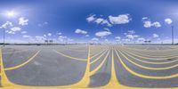 An empty parking lot in Toronto, Canada, with yellow lines painted on the asphalt. Partly cloudy sky adds depth to the urban landscape. A perfect day for exploring the city's architectural marvels.
