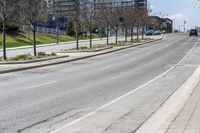 a road with a curb and parked cars on the side of it and buildings on the other side