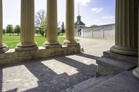 An elevated view of a classic architecture castle in Toronto, Canada. The lush green vegetation surrounding the castle adds to its historic charm. The clear sky and sunlight create a picturesque scene.
