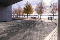A view of a beautiful house in Toronto, Canada. The house is surrounded by trees and features a spacious backyard with a pier and benches. The autumnal colors of the trees make it a picturesque scene.
