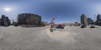 A busy intersection in Toronto, Canada. Modern architecture and residential buildings line the streets. Cars and vehicles traverse the asphalt roads. Clear sky and hard shadows add depth to the urban landscape.