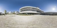A modern office building in Toronto, Canada, with a stunning beachfront view. The sleek architecture and glass facade reflect the clear sky. The building stands tall against the backdrop of the shoreline, exuding a sense of urban sophistication.