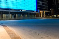 Nighttime view of a blue and black lit up building in Toronto, Canada. The building stands next to a road, creating an open space feel. A captivating urban scene.