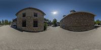 A suburban home in Toronto, Canada. The straight road leads to the circularly opposite faces of the building. Clear sky casts hard shadows on the asphalt surface. A picturesque residential entry for a beautiful day.
