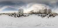 a snow covered field with tracks in the snow and a wall covered in trees with lots of snow