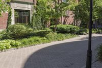 This is an image of a classic architecture residential area in Toronto, Canada. The photo shows a small road with asphalt surface surrounded by trees and grass. The neighborhood features residential properties with driveways and walkways. The urban design incorporates concrete streets and curbs. The image captures the essence of city life in Toronto, with its entryways and public spaces. The photo represents the combination of classic architecture and modern urban design in this vibrant city.