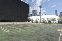 A modern architectural marvel in downtown Toronto, Canada. The office building stands tall against the city skyline, surrounded by an open park space. The parking lot next to it offers convenience to city life and business district visitors.