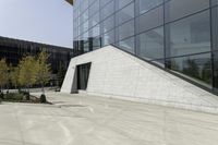 This is a photo of a cityscape in Toronto, Canada. The image showcases the urban design with low-rise buildings and office buildings made of concrete and glass facades. The roads are covered with asphalt, and there is a mix of vegetation, including trees and shrubs, adding a touch of green to the landscape. The photo also captures an open space with a sloped curb and fixtures such as streetlights. This image represents the modern and vibrant atmosphere of the city of Toronto.
