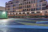 A view of Toronto cityscape at dawn. The city comes to life with the glow of artificial lights on modern architecture and apartment buildings. Graffiti walls add a touch of color to the urban landscape.