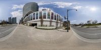 A 360-degree view of Toronto's modern architecture, with high-rise buildings lining the streets. The image, captured with a fish-eye lens, showcases the vibrant city life and urban design. Clear skies contrast with the grey buildings and glass walls.