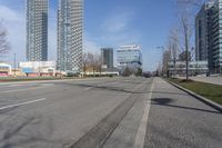 This stock photo showcases a cityscape in Toronto, Canada. The image captures an empty city street with many skyscrapers and buildings near the end of the road. The modern architecture and urban design are prominent features of this neighborhood in Ontario. The clear sky and contrails in the background add to the metropolitan atmosphere. The photo is taken during the day, highlighting the bustling city life in the business district. The well-maintained road surface and infrastructure contribute to the overall appeal of this city view. The high-rise condominiums and office buildings create an impressive skyline. The photograph represents the urban charm and progress of Toronto, making it an ideal choice for various commercial and creative projects.