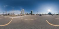 a panoramic image of several car parking lots and buildings with sun in back