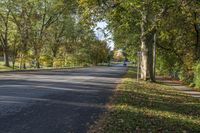 A picturesque road in Ontario, Canada, surrounded by lush vegetation and autumn colors. Sunlight filters through the canopy of deciduous trees, creating a beautiful play of tints and shades. A serene suburban public space in Toronto.