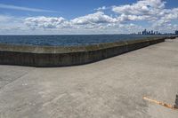 A scenic view of the coastal architecture in Toronto, Ontario. The concrete road leads to the tranquil waters of Lake Ontario. The horizon is lined with clouds, creating a picturesque backdrop. A perfect day for a walk along the shore.