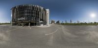 A modern office building in Toronto's financial district, surrounded by a parking lot. The clear sky enhances the sleek architecture. The urban landscape showcases the city's vibrant business district.