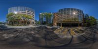 A unique perspective of two high-rise buildings in Toronto, captured through a fish-eye lens. The urban landscape is accentuated by the clear sky and the vibrant yellow leaves on the trees. The buildings stand tall amidst the bustling city streets.