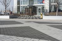 This stock photo captures the modern architecture of a city in downtown Toronto, Canada. The image showcases a large open courtyard with a lot of tiles on the floor, surrounded by a mixed-use building. The concrete facade of the building features a patterned design with lines and columns. The bright daylight casts shadows on the tiles, creating a dynamic visual effect. The road surface and walkway leading to the entrance are made of composite material. The image also includes the entrance door and a shaded area with wood flooring. The urban design is enhanced with decorative elements such as a flag and flower-filled deck. This photo represents the vibrant city life and business district of Toronto.