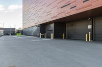 A modern architecture office building in Toronto, Canada. The composite material facade offers a sleek and contemporary design. The grey concrete surface and asphalt parking garage provide ample parking space. Loading docks and driveways are also part of this urban design.