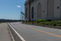 This is an image of a residential area in Toronto, Canada. The photo shows a house with windows overlooking the street. The road is made of asphalt and there is a tree lined with vegetation along the curb. Overhead power lines can be seen in the background. The clear sky and street light illuminate the area. This photo represents a typical day in a residential neighborhood in Toronto.
