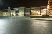 this is a parking lot at night with lights shining on the building and sidewalk in front of it