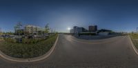A straight road in Toronto's business district lined with modern architecture. Cars parked on the asphalt below, with the sun peeking over the buildings. Hard shadows create a dramatic effect.