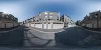 a panoramic view of an intersection with a lot of buildings and a blue sky