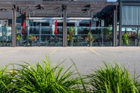 an empty building with red flags hanging on the front and outside of it and there are large green plants in the foreground