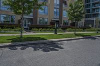 A view of a residential street in Toronto, Ontario. Lined with tall trees and lush vegetation, the road surfaces are made of asphalt. The cityscape showcases urban design with well-maintained homes and buildings.
