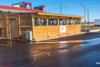 a wooden shop front with a red roof in the middle of the street and it's water reflecting on the road