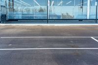 an empty parking lot with a clear glass window in the background while someone takes a picture