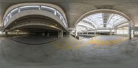 A view from the top of an indoor parking garage in Toronto, Canada. The straight road leads to the city center, lined with concrete buildings. A train runs underneath, adding to the urban design.